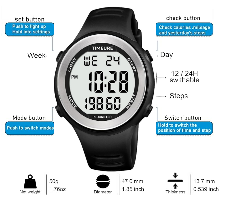 Most Timeure watches use a button-based system, and even pedometer models follow a similar setup process. Once you understand how the buttons work, setting the time becomes quick and straightforward.